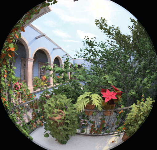 Figure 6.16: Image rendered using a fish-eye lens with a very wide field of view. Note the darkening at the edges, which is due to accurate simulation of the radiometry of image formation (Section 6.4.7) and the distortion of straight lines to curves, which is characteristic of many wide-angle lenses but isn’t accounted for when using projection matrices to represent the lens projection model.