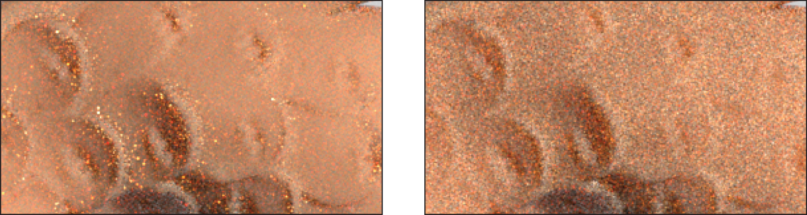 Figure 15.9: Comparison of Scattering Profile Projection. (a) Projecting the scattering profile perpendicularly along the current normal direction usually works well, but occasionally there are surface regions that are sampled with a very small probability despite a large corresponding BSSRDF value upper S , producing high variance in renderings. (b) Projecting along multiple axes and combining the resulting sampling techniques using multiple importance sampling greatly reduces the maximum variance at the cost of an increase in the overall amount of variance in well-converged regions. As more samples are taken, the latter approach shows better overall convergence.