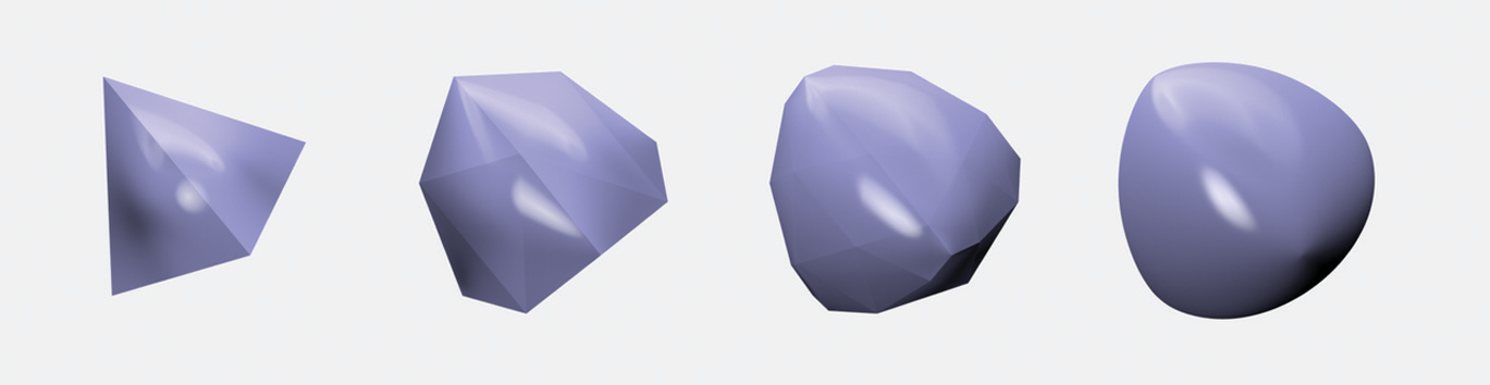 For appropriately chosen subdivision rules, this process converges to give a smooth limit surface as the number of subdivision steps goes to infinity. In practice, just a few levels of subdivision typically suffice to give a good approximation of the limit surface. Figure 3.24 shows a simple example of a subdivision, where a tetrahedron has been subdivided zero, one, two, and six times.