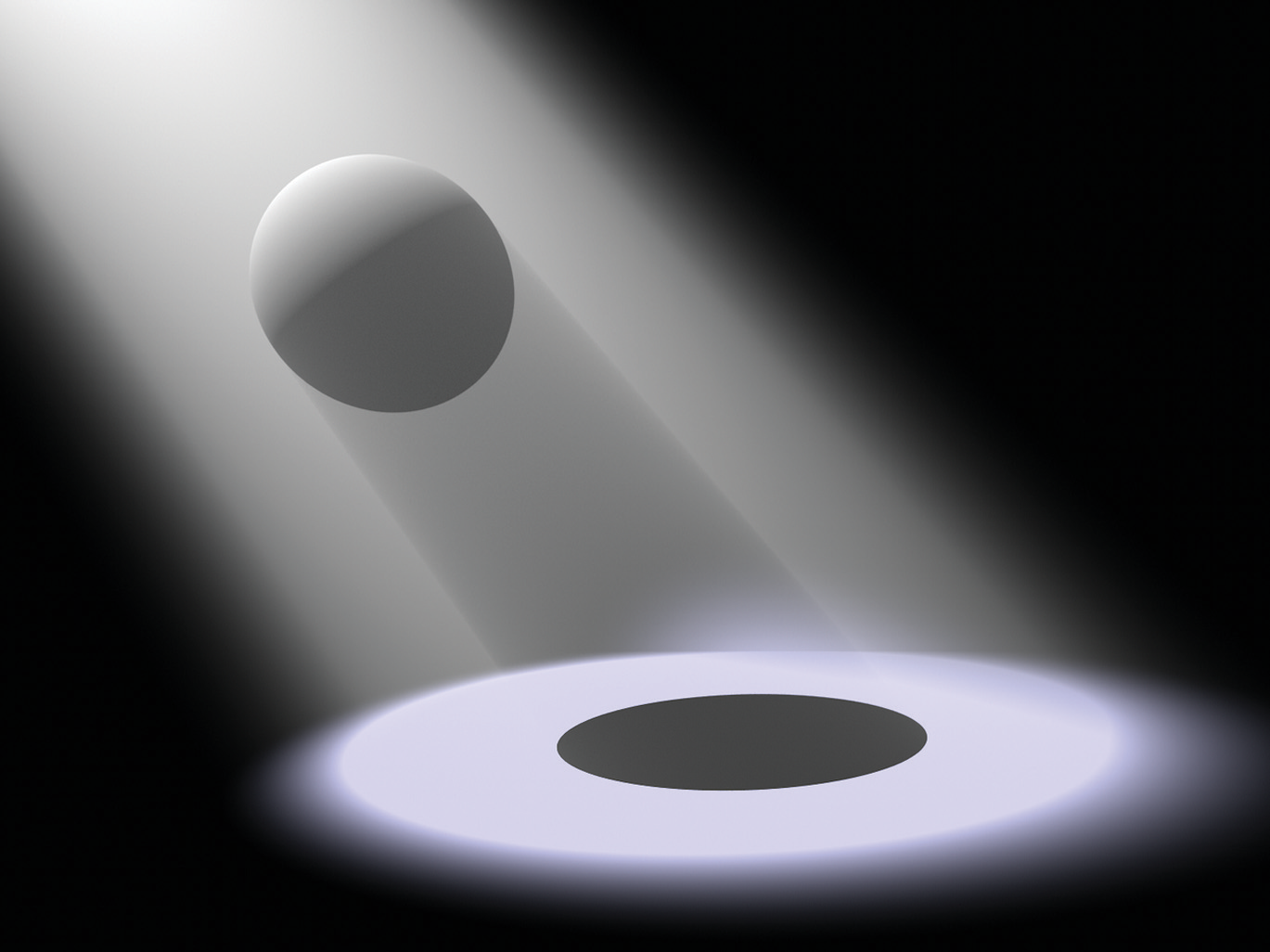 The characteristics of all of these properties may be homogeneous or inhomogeneous. Homogeneous properties are constant throughout some region of space, while inhomogeneous properties vary throughout space. Figure 11.1 shows a simple example of volume scattering, where a spotlight shining through a participating medium illuminates particles in the medium and casts a volumetric shadow.
