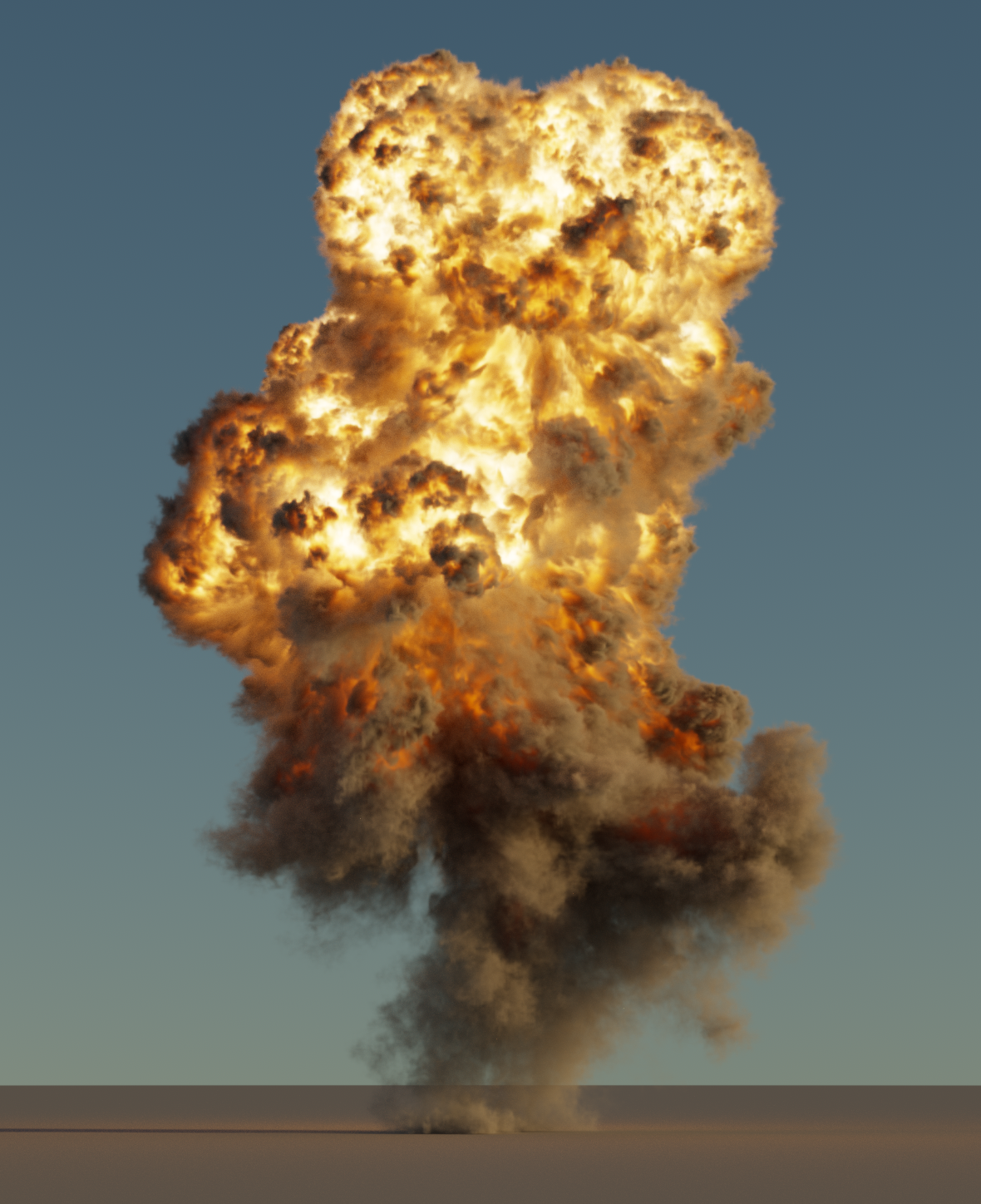 The discussion so far has assumed that rays are traveling through a vacuum. For example, when describing the distribution of light from a point source, we assumed that the light’s power was distributed equally on the surface of a sphere centered at the light without decreasing along the way. The presence of participating media such as smoke, fog, or dust can invalidate this assumption. These effects are important to simulate: a wide class of interesting phenomena can be described using participating media. Figure 1.12 shows an explosion rendered by pbrt. Less dramatically, almost all outdoor scenes are affected substantially by participating media. For example, Earth’s atmosphere causes objects that are farther away to appear less saturated.
