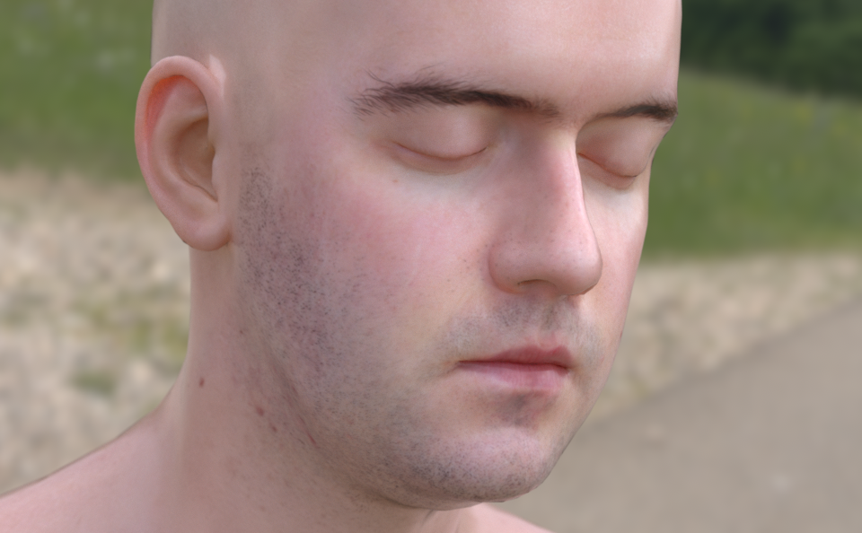 It is easy to generalize the notion of a BRDF to transmitted light (obtaining a BTDF) or to general scattering of light arriving from either side of the surface. A function that describes general scattering is called a bidirectional scattering distribution function (BSDF). pbrt supports a variety of BSDF models; they are described in Chapter 9. More complex yet is the bidirectional scattering surface reflectance distribution function (BSSRDF), which models light that exits a surface at a different point than it enters. This is necessary to reproduce translucent materials such as milk, marble, or skin. The BSSRDF is described in Figure 1.10 shows an image rendered by pbrt based on a model of a human head where scattering from the skin is modeled using a BSSRDF.