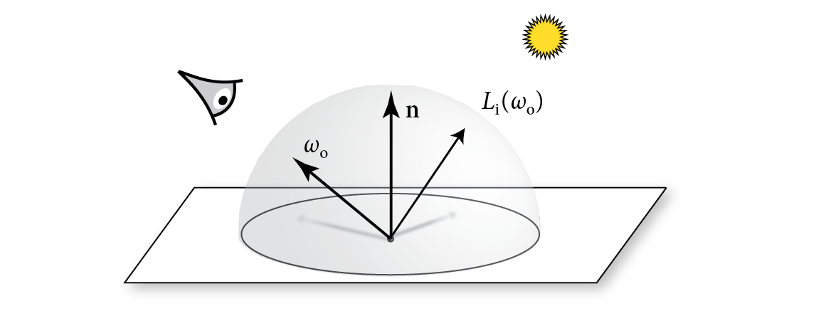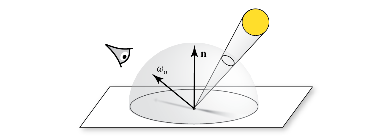 Being able to sample directions at a point where illumination may be incident is an important sampling operation for rendering. Consider a diffuse surface illuminated by a small spherical area light source (Figure 12.1): sampling directions using the BSDF’s sampling distribution is likely to be very inefficient because the light is only visible within a small cone of directions from the point. A much better approach is to instead use a sampling distribution that is based on the light source. In this case, the sampling routine should choose from among only those directions where the sphere is potentially visible.
