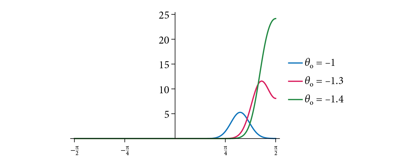 Figure 9.26 shows a plot of the Trowbridge–Reitz function for a few values of . Observe how the function is close to one over much of the domain but falls to zero at grazing angles, where masking becomes dominant. Increasing the surface roughness (i.e., higher values of ) causes the function to fall off more quickly.