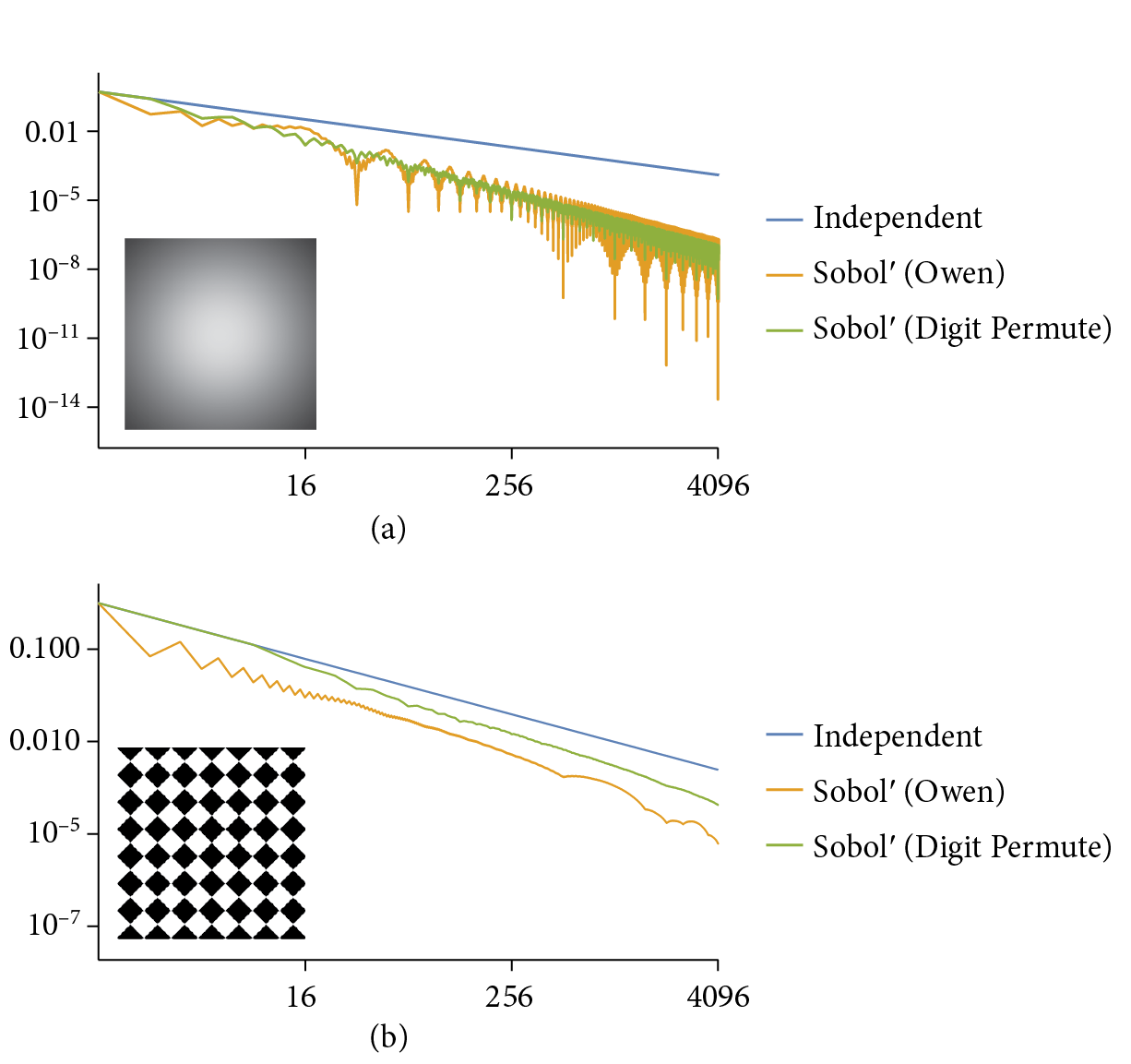 While the Halton sequence is effective for Monte Carlo integration, each radical inverse computation requires one integer division for each digit. The integer division instruction is one of the slowest ones on most processors, which can affect overall rendering performance, especially in highly optimized renderers. Therefore, in this section we will describe three Samplers that are based on the Sobol’ sequence, a low-discrepancy sequence that is defined entirely in base 2, which leads to efficient implementations.