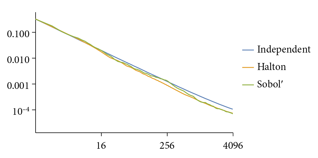 Figure 8.46 shows the performance of Sobol’ sample points with the two test functions. It does well with both, but especially so with Owen scrambled points and the smooth Gaussian function, where it has an asymptotically faster rate of convergence. Figure 8.47 graphs MSE versus the sample count for the blurry dragon test scene from Figure 8.32. Both the Halton and Sobol’ samplers have roughly 10% lower MSE than independent sampling at equivalent sample counts.