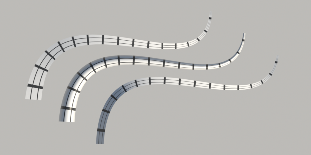 The Curve shape is defined by a 1D Bézier curve along with a width that is linearly interpolated from starting and ending widths along its extent. Together, these define a flat 2D surface (Figure 6.30). It is possible to directly intersect rays with this representation without tessellating it, which in turn makes it possible to efficiently render smooth curves without using too much storage.
