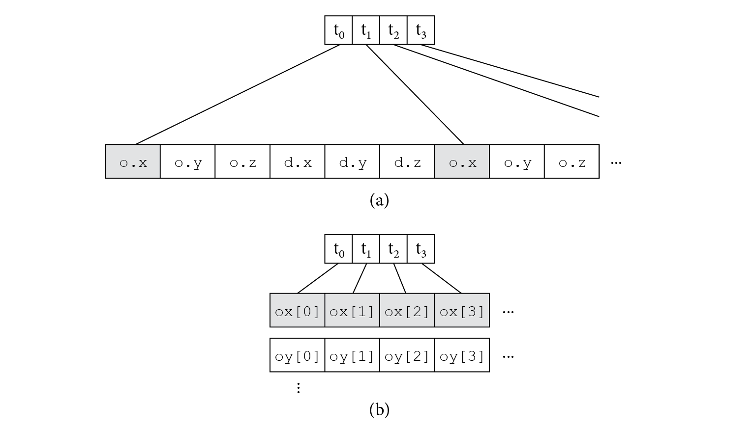 In turn, if the threads in a thread group want to load the x component of their ray’s origin, the expression rays.ox[i] suffices to load that value. The locations accessed are contiguous in memory and span many fewer cache lines (Figure 15.5(b)).